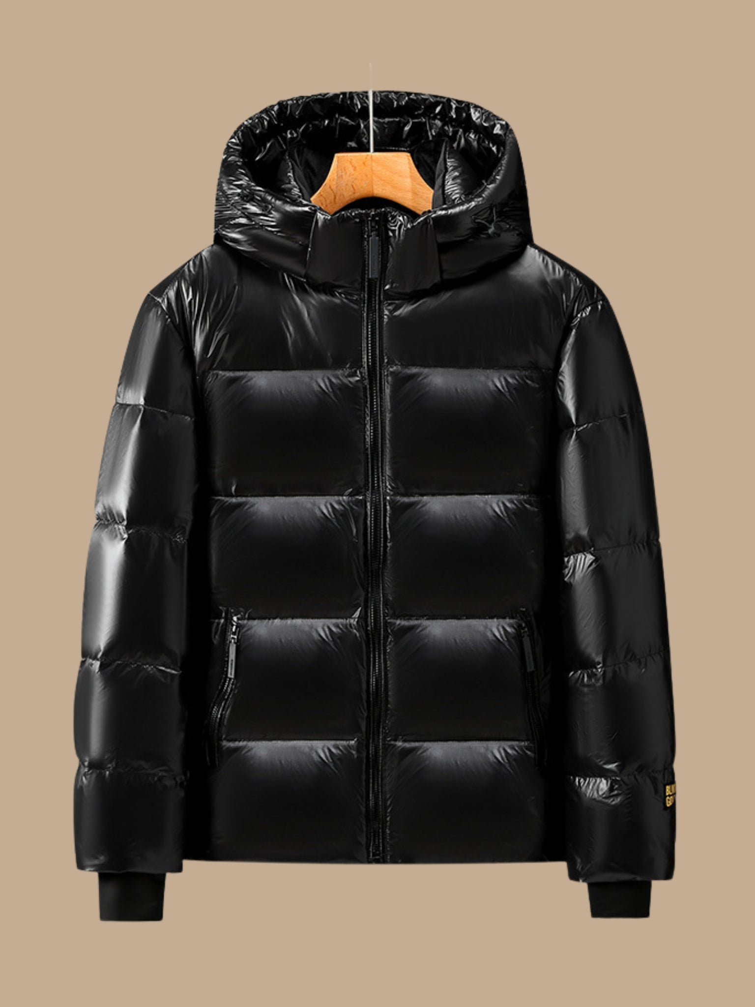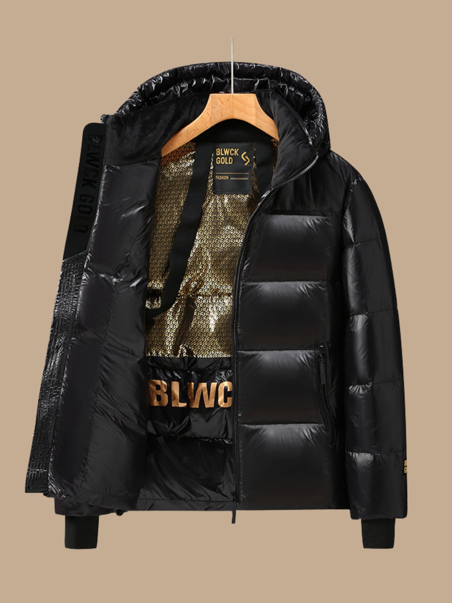 Deze heren donzen pufferjas met goudkleurige binnenvoering brengt luxe en functionaliteit samen. De 550-fill witte eendendons zorgt voor betrouwbare isolatie, terwijl het glanzende zwarte oppervlak en de subtiele goudaccenten de jas een opvallende, moderne uitstraling geven.